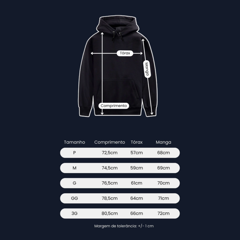 Conta com capuz forrado e bolso canguru para garantir conforto e versatilidade nos dias frios.